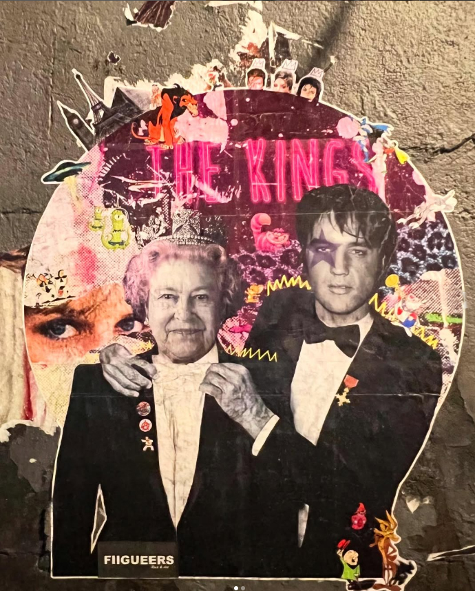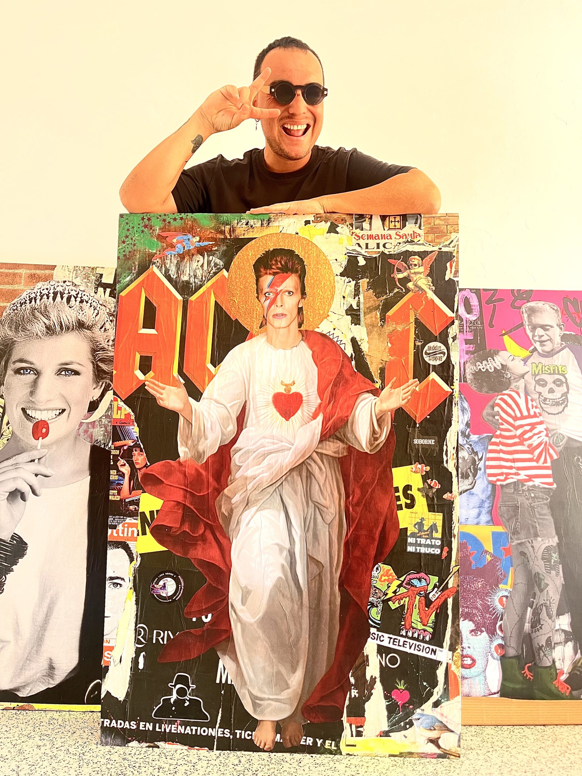 Mis locuras nacen en el Collage digital y como bien dices, dentro de mi caos. Nunca tengo una idea clara de lo que quiero hacer, es un desorden constante en mi cabeza, antes de llegar al final de la obra. Muchas veces empiezo con un rumbo que me parece lo más, pero en mi catarsis se va moldeando y la mayoría de las veces no es nada parecido a la idea concebida en un principio. Una vez terminado digitalmente, lo imprimo y salgo a pegarlo a la calle. Luego de que el paste up está en la urbe, llega otro momento de caos en mí, ahora empieza el collage analógico, en donde suelo hacer mis obras en soportes de madera, mezclando así, materiales reciclados como cartelera callejera, con un sinfín de materiales para crear una obra llena de texturas entre desorden y mucho Rock & Roll!
