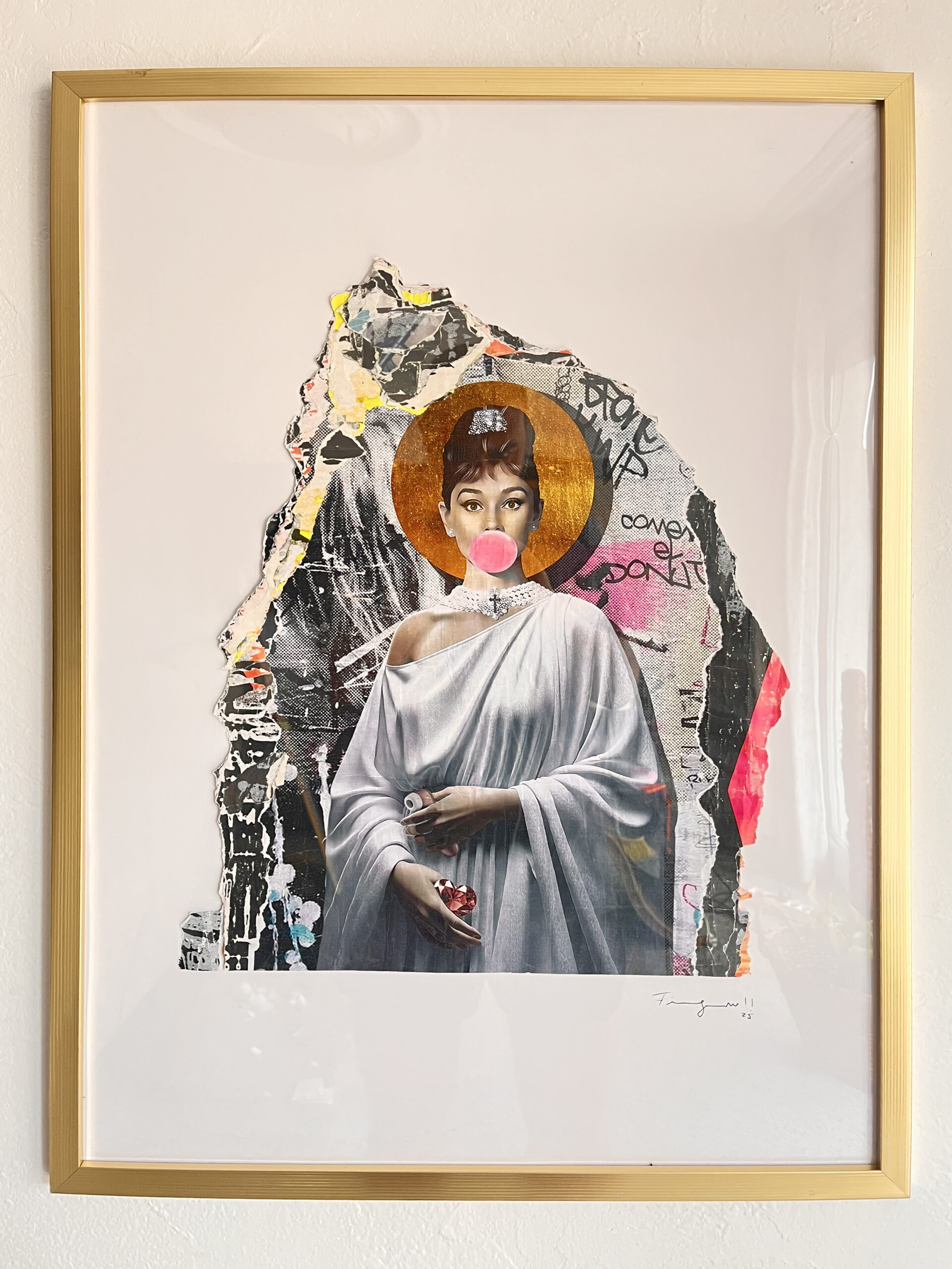 Con respecto a los formatos que trabajo son varios, uno de ellos son mis laminas enumeradas, a un precio súper asequible para cualquier público y de ahí saltamos a mi gran formato, hechas en una base de madera contrachapada de 120 x 80 cm, cada pieza es única en su fondo. También trabajo utilizando como base de mi obra, cartelera reciclada. Son capas y capas de carteles que crean una base sólida, con la cual se puede trabajar y dejando un lenguaje mucho más urbano a la pieza, y como último me he aventurado en la escultura, recogiendo basura de contenedores de la construcción he creado La Torre, una obra sin referentes. Tienes que verla.